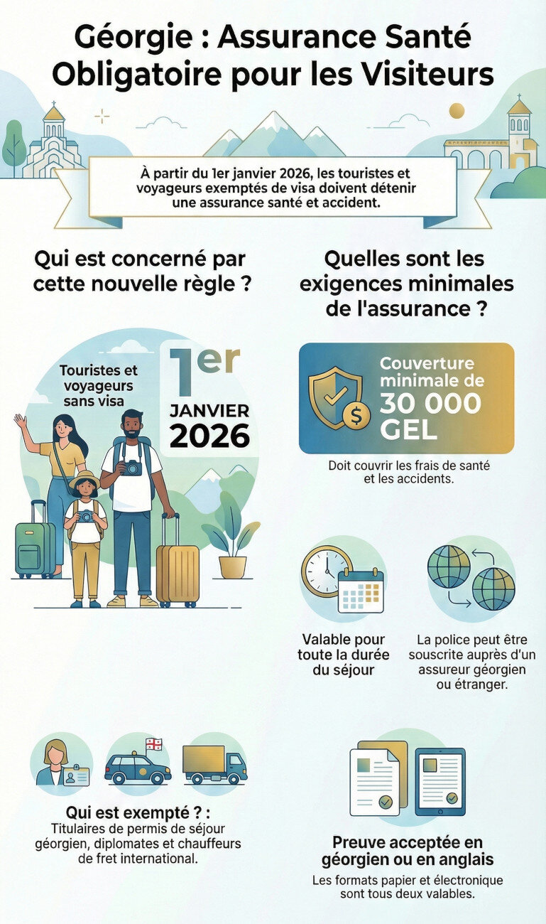 À partir du 1er janvier 2026, la Géorgie imposera une nouvelle réglementation exigeant que les visiteurs étrangers sous régime sans visa ou avec un visa de tourisme détiennent une assurance santé et accidents. Cette obligation légale prévoit une couverture minimale de 30 000 GEL pour toute la durée du séjour, bien que certains résidents et diplomates en soient exemptés. Les voyageurs pourront présenter une attestation en géorgien ou en anglais, sous format physique ou numérique, provenant d’un assureur local ou international agréé.