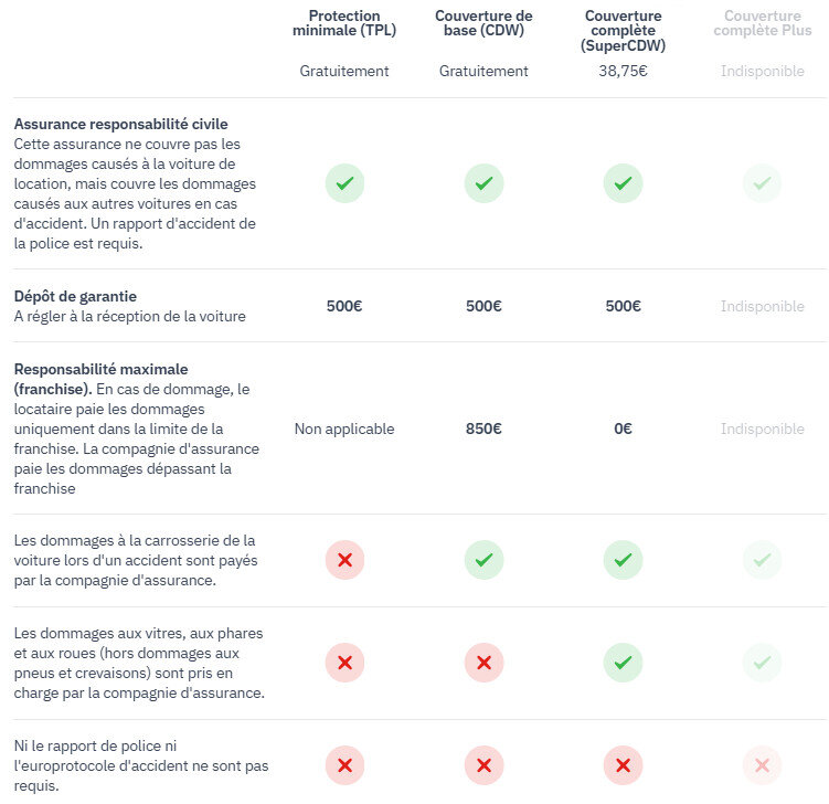 - Couverture de base (CDW = Collision Damage Waiver) : C’est la base. Elle couvre les gros dégâts mais laisse une franchise (ce que vous payez) en cas d’accident.