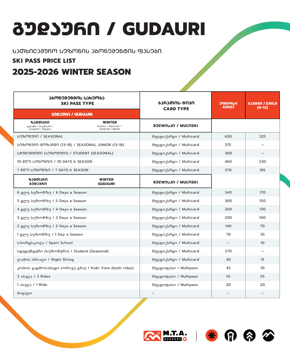 Gudauri est considérée comme une destination de ski très abordable comparativement aux standards européens. Le prix actuel d’un forfait de ski d’une journée complète est de 70 GEL (environ 22 EUR), auquel s’ajoute un dépôt remboursable de 5 GEL pour la carte en plastique rechargeable. Ce prix représente environ un tiers du prix moyen d’un forfait dans les stations européennes. Des options de forfaits multi-jours sont disponibles, allant de 140 GEL pour deux jours à 460 GEL pour 10 jours. Un seul trajet en télésiège coûte 14 GEL (4,40 EUR), tandis que le ticket le plus onéreux est le forfait Multiski illimité pour toutes les stations de Géorgie, s’élevant à 650 GEL (206 EUR). Les enfants âgés de 6 à 12 ans bénéficient de forfaits à moitié prix, et ceux de moins de six ans voyagent gratuitement. De plus, les forfaits de ski sont réduits de 50 % en avril. Enfin, si les remontées mécaniques sont incluses dans le forfait, il est aussi possible d’acheter un ticket séparé pour le téléphérique Kobi-Gudauri pour 45 GEL.